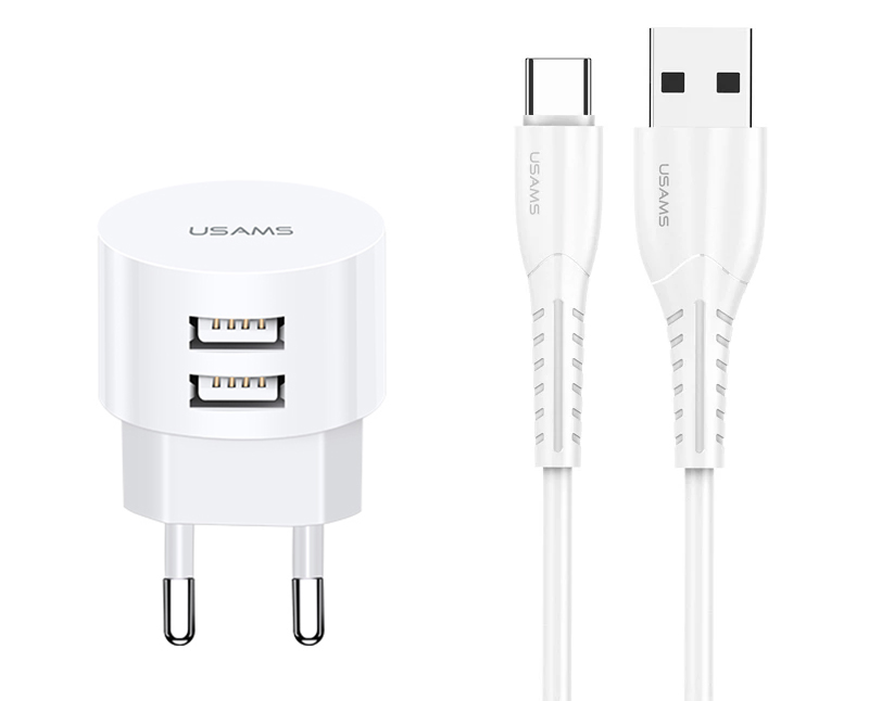 USAMS φορτιστής τοίχου T20 & καλώδιο type-C, 2x USB, 2.1A, λευκός
