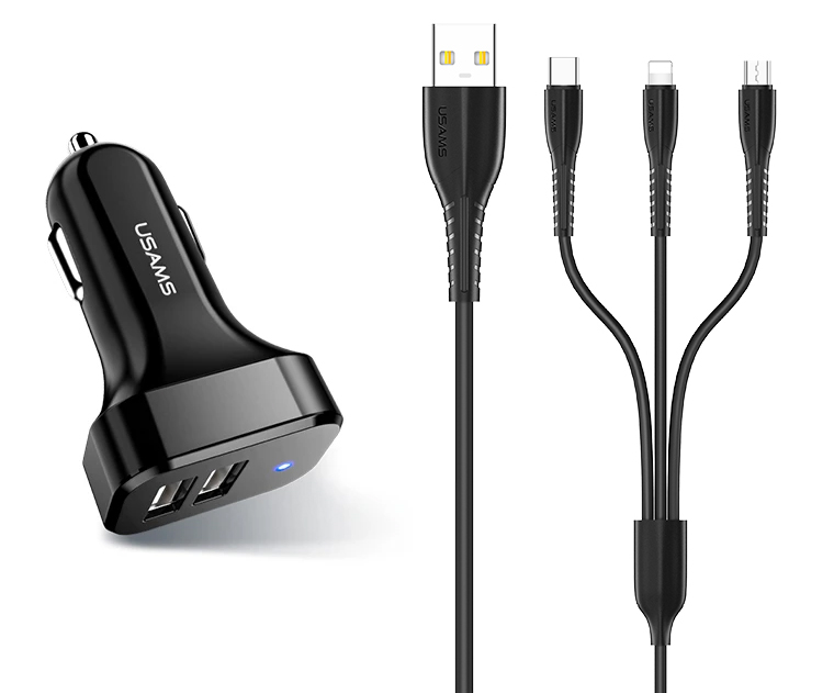 USAMS φορτιστής αυτοκινήτου C13 & καλώδιο 3 σε 1, 2x USB, 2.1A, μαύρο