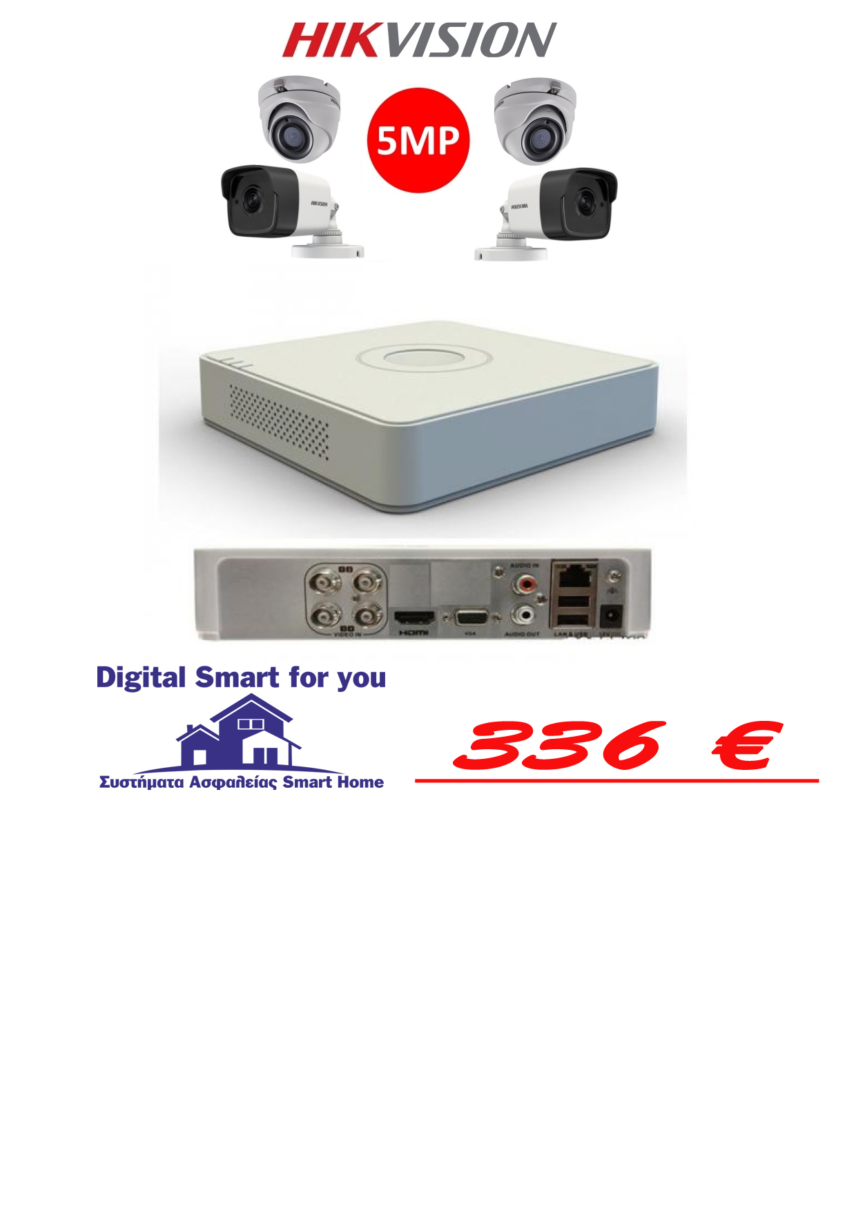 Η προσφορά περιλαμβάνει τέσσερις κάμερες υψηλής ανάλυσης 5 megapixel εσωτερικού και εξωτερικού χώρου ένα καταγραφικό 4 ενσύρματων καμερών 5 megapixel και μίας διαδικτυακής κάμερας τύπου IP.