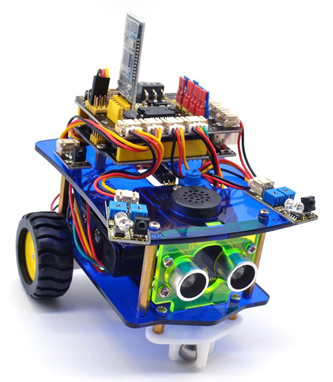 Το kit desktop mini bluetooth smart car V3.0 σας δίνει την δυνατότητα να κατασκευάσετε το δικό σας smart car ρομπότ μέσω της ολοκλήρωσης πολλών δημιουργικών projects και να μάθετε να το ελέγχετε με mixly blocks coding. Διαθέτει λειτουργίες όπως line tracking, αποφυγή εμποδίων, cross maze, ultrasonic following, gravity sensing, φωνητικό έλεγχο, έλεγχο από ασύρματο χειριστήριο IR και smartphone μέσω Bluetooth. Επιπλέον συμπεριλαμβάνει μονάδα ήχου μικρόφωνου που επιτρέπει την αναπαραγωγή μουσικής ή άλλων ήχων κατά την διάρκεια της οδήγησης του smart car. Ο έλεγχος από smartphone γίνεται μέσω της εφαρμογής Dekstop Car για Android και της εφαρμογής Keyes BT Car για iOS. Η τροφοδοσία του ρομπότ μπορεί να γίνει με 2x μπαταρίες 18650 ή 4x μπαταρίες AA 1,5V (δεν συμπεριλαμβάνονται).