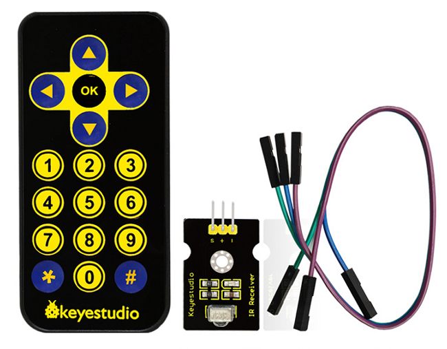 IR receiver module kit της Keyestudio για Arduino. To kit αποτελείται από 1 εξαιρετικά λεπτό ασύρματο χειριστήριο 17 πλήκτρων λειτουργίας, IR receiver module 38KHZ και καλώδιο 3-Pin dupont line θηλυκό σε αρσενικό.